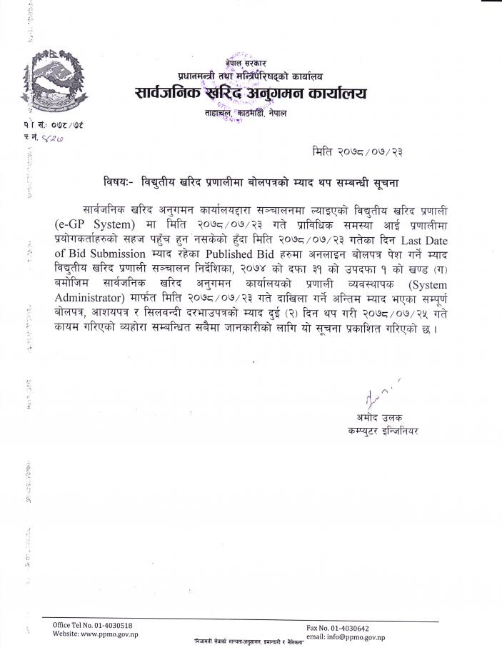 विद्युतिय खरीद प्रणालीमा बोलपत्रको म्याद थप सम्बन्धी सार्बजनिक खरिद अनुगमन कार्यालय काठमाण्डौको सुचना