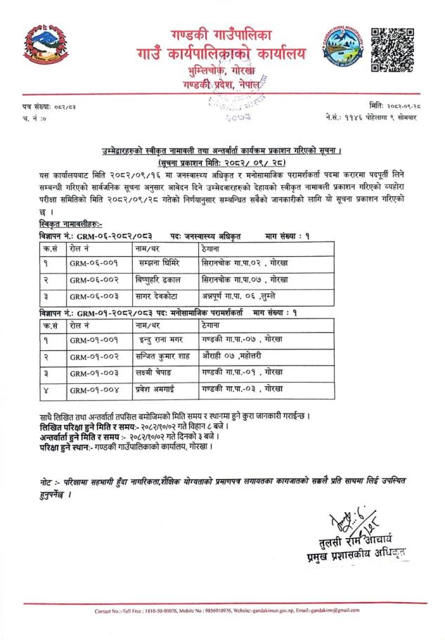 उम्मेद्धारहरुको स्वीकृत नामावली तथा अन्तर्वार्ता कार्यक्रम प्रकाशन गरिएको सूचना !! सूचना प्रकाशन मितिः२०८२/०९/२८ गते।