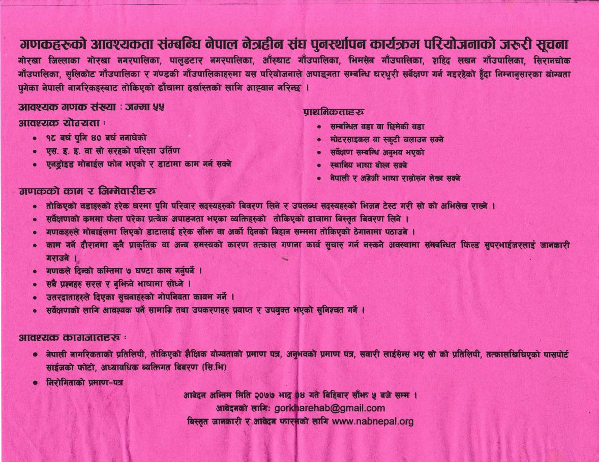 गणकहरुकाे आवश्यकता सम्बन्धि नेपाल नेत्रहिन सँध पुनर्स्थापना कार्यक्रम परियोजनाको जरुरी सूचना