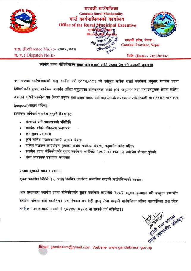 स्थानीय तहमा जीविकोपार्जन सुधार कार्यक्रमको लागि प्रस्ताव पेश गर्ने सम्बन्धी सूचना !!! थप जानकारीका लागिः ९८४४६१०४२७ गते।