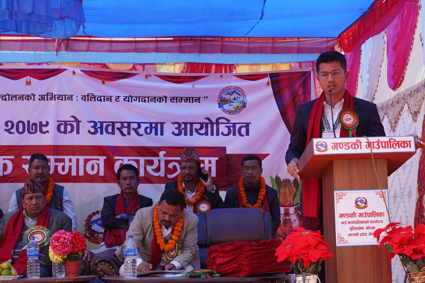 मिति २०७९/११/०१ गते गण्डकी गाउँपालिकामा गाउँपालिका अध्यक्ष श्री दिपक तिमिल्सिना साकार ज्यु, प्रमुख अतिथी नेपाल सरकारका उपप्रधानमन्त्री एवं भौतिक पुर्बाधार तथा यातायात मन्त्री माननीय नारायण काजी श्रेष्ठज्यु , बिशेष अतिथी पुर्व सांसद माननीय श्री हरिराज अधिकारीज्यु को आतिथ्यमा जनयुद्द दिवस २०७९ को अवसरमा नागरिक सम्मान कार्यक्रम भब्य रुपमा सम्पन्न भयो । कार्यक्रममा गाउपालिका भित्र सहिद हुनुभएका महानुभाबहरु, घाइते एब बेपत्ता नागरिक, कृषक, पशुपालक, जग्गादाता, पुर्ब जन्प्रतिनिधीहरु तथा SEE र कक्षा ८ मा सर्वोत्कृष्ट नतिजा ल्याउने विद्यालय, विद्यार्थी र शिक्षकहरु लाई सम्मानित गरिएको थियो । कार्यक्रम कै दौरान आयोजना गरिएको कविता प्रतियोगिता मा भैरबाश्रम मा.वि की अरुणा ढकाल प्रथम भएकी थिइन ।