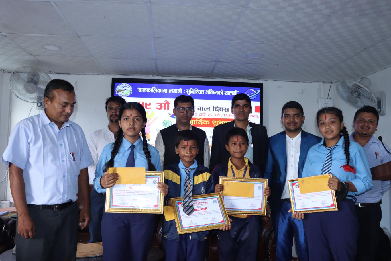 "बालबालिकामा लगानी : सुनिश्चित भविष्यको थालनी" भन्ने नारा सहित ५९ औँ राष्ट्रिय बाल दिवस २०८० को अवसरमा गण्डकी गाउँपालिका, गाउँ कार्यपालिकाको कार्यालय, शिक्षा युवा तथा खेलकुद शाखा, भुम्लिचोक, गोरखाद्वारा सञ्चालित आधारभुत तह (६-८) का लागि "बालविवाहका मुख्य कारण र न्युनी करणका उपायहरु" तथा माध्यमिक तह (९-१०) का लागि "बालबालिकाहरुको हक हितका लागि स्थानिय तहले गर्नु पर्ने कामहरु" विषयमा बक्तृत्वकला प्रतियोगिता सम्पन्न भएको छ। जस अन्तर्गत आधारभुत तह (६-८) को प्रतियोगितामा श्री रत्नेश्वर मा.वि., गण्डकी-५, दर्बुङ्गका कक्षा ७ का छात्र सुमन कोइराला प्रथम, श्री भैरवाश्रम मा.वि. गण्डकी-३, फुजेलका कक्षा ८ का छात्र निशान श्रेष्ठ द्वितीय, श्री ज्ञानमार्ग मा.वि, गण्डकी-७, घ्याल्चोकका कक्षा ७ की छात्रा आयुषा रेग्मी तृतीय तथा श्री चित्रादेवी आ.वि, गण्डकी-८, सिउरेनीटार, गोरखाकी कक्षा ८ की छात्रा सबी माझी सान्त्वना स्थान हासिल गर्नुभयो । यस्तै माध्यमिक तह (९-१०) को प्रतियोगितामा श्री रत्नेश्वर मा.वि., गण्डकी-५, दर्बुङ्गका कक्षा १० की छात्रा कविता कोइराला प्रथम, श्री ताङ्लिचोक मा.वि. गण्डकी-२, पातिस्वाराका कक्षा १० की छात्रा अनुष्का दाहाल द्वितीय, श्री ज्ञानमार्ग मा.वि, गण्डकी-७, घ्याल्चोकका कक्षा १० की छात्रा करुणा पाण्डे तृतीय तथा श्री भैरवाश्रम मा.वि, गण्डकी-३, फुजेलका कक्षा १० की छात्रा अनुपा श्रेष्ठले सान्त्वना स्थान हासिल गर्नुभयो । प्रतियोगिताका विजेताहरुले क्रमश: नगद रु. ५ हजार, २५ सय, १५ सय र १ हजार प्राप्त गर्नु भयो । शिक्षा अधिकृत सुदिप पन्थको अध्यक्षतामा भएको कार्यक्रममा गोरखा क्याप्स गोरखाका सहायक क्याम्पस प्रमुख नवराज पाण्डेको प्रमुख आतिथ्यता तथा गोरखा क्याम्पस गोरखाका सहायक प्राध्यापक ठाकुर प्रसाद खनालको आतिथ्यता रहेको थियो। विजेता सम्पूर्णमा बधाई सहित सक्रिय सहभागिताका लागि सम्पूर्ण विद्यालयका विद्यार्थी भाई वहिनिमा हार्दिक धन्यवाद ज्ञापन गर्दै उज्जवल भविष्यको कामना गर्दछौँ।